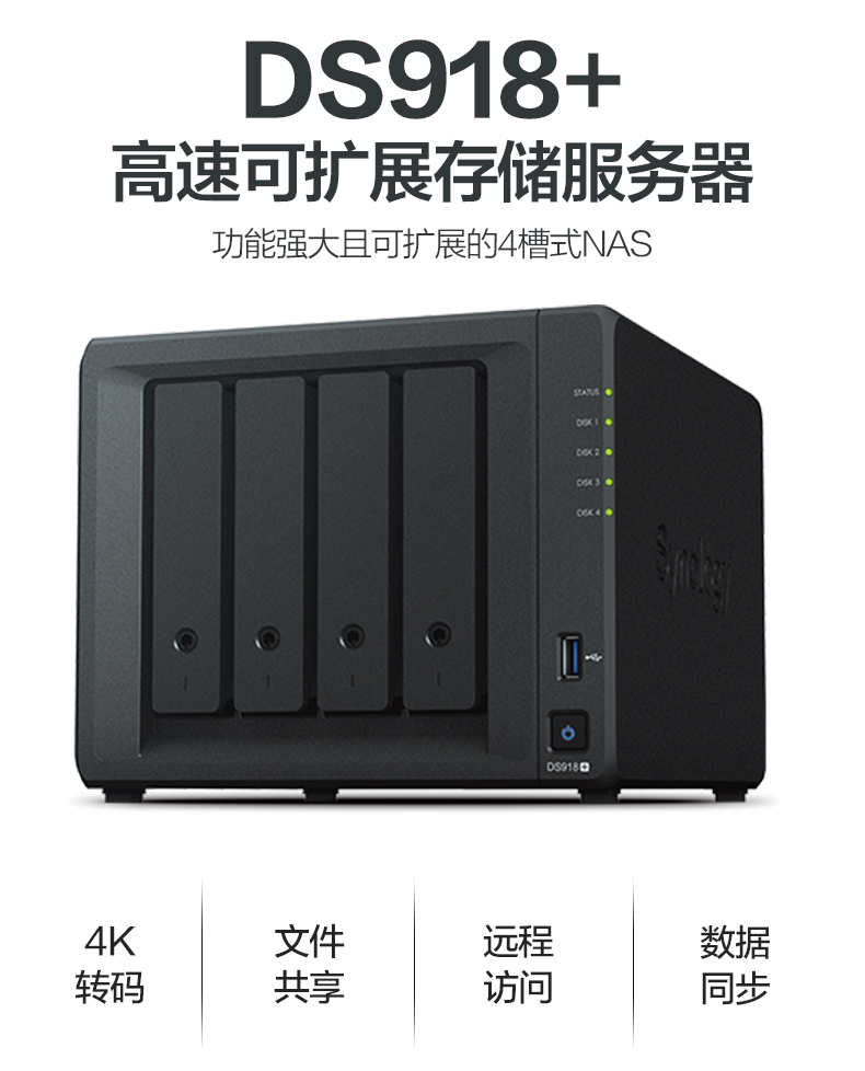 DS918+ 支持多達(dá)兩個(gè) M.2 NVMe 2280 SSD,無需占用內(nèi)部硬盤插槽即可快速創(chuàng)建系統(tǒng)緩存。DS918+ 可通過 Synology 擴(kuò)充設(shè)備 DX517 擴(kuò)展到多達(dá) 9 個(gè)硬盤,滿足了對靈活存儲容量的需求。