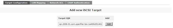 接下來是添加一個(gè) iSCSI Target。首先點(diǎn)擊菜單“Volumes”,然后在右側(cè)的“Volumes section”區(qū)域中選擇“iSCSI Targets”。在“Target Configuration”子菜單中的“Add new iSCSI Target”區(qū)域,選擇列出的“Target IQN”。最后點(diǎn)擊“Add”按鈕,從而添加了一個(gè) iSCSI Target。注意,此處的 Target IQN 信息在后面的對 ESX 服務(wù)器的存儲(chǔ)配置過程中會(huì)用到。如圖