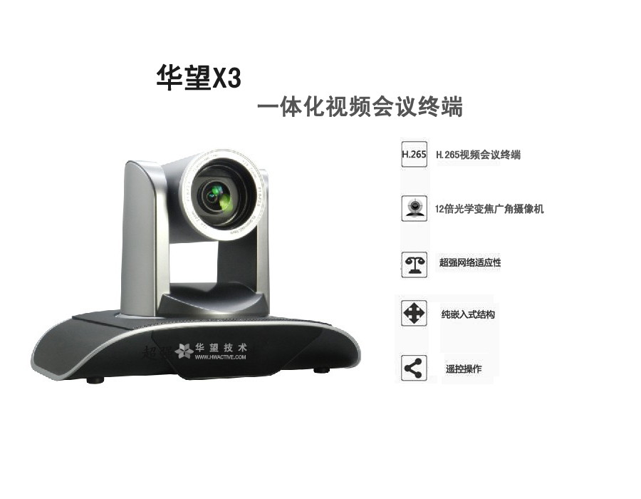 產(chǎn)品特性:內(nèi)置高清視頻會(huì)議終端+12倍光學(xué)變焦廣角攝像機(jī),安裝部署更簡(jiǎn)單;業(yè)界首推H.265編解碼,降低40%帶寬占用;1080P高清分辨率;支持遙控器操作